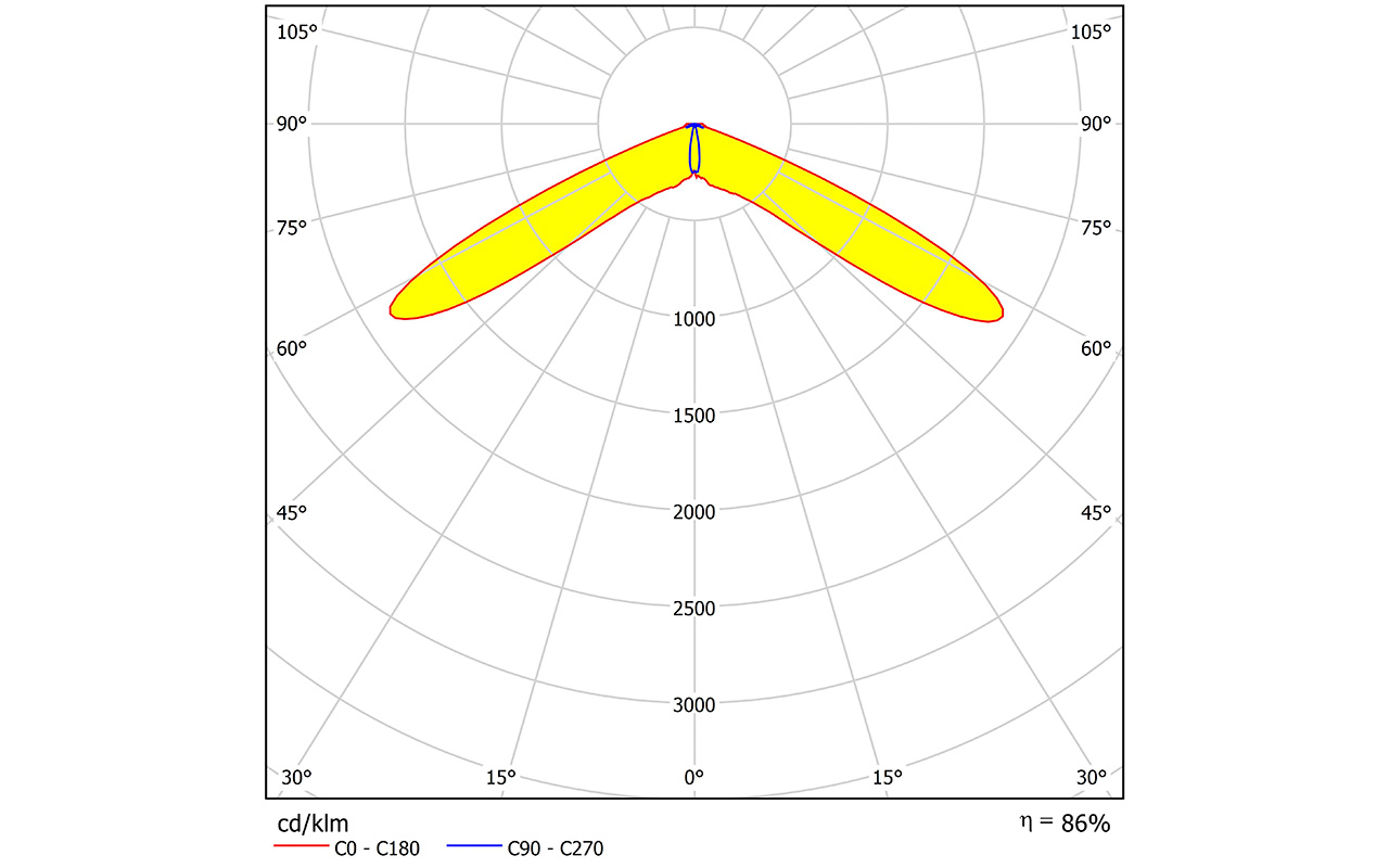 Ця діаграма дозволяє позначити шляхи евакуації в задимленому приміщенні світильниками, розташованими на відстані до 26 метрів один від одного вздовж стіни, та оптимізована для встановлення на стелі вище 5 метрів. На візуалізації нижче показана робота аварійних світильників, встановлених на висоті 6 метрів.
